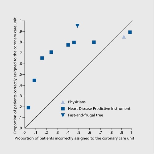 شکل 2: عملکرد یک درخت تصمیم برای تخصیص بیماران به بخش مراقبتهای ویژه قلبی (CCU)، در مقایسه با ابزار پیشبینی کننده بیماری قلبی و قضاوت پزشکان. محور افقی نشاندهنده نسبت بیمارانی است که به اشتباه به بخش مراقبتهای ویژه قلبی ارجاع داده شدهاند (نرخ مثبت کاذب)، و محور عمودی نسبت بیمارانی را نشان میدهد که به درستی به این بخش ارجاع داده شدهاند (حساسیت). خط مورچین نشاندهنده سطح عملکرد تصادفی است و ناحیه سمت چپ این خط، عملکرد بهتر از تصادف را نشان میدهد. توجه داشته باشید که تصمیمهای تخصیص ابزار پیشبینی کننده بیماری قلبی، به چگونگی تعادل بین حساسیت و نرخ مثبت کاذب بستگی دارد. به همین دلیل چندین نقطه داده برای این ابزار نشان داده شده است.